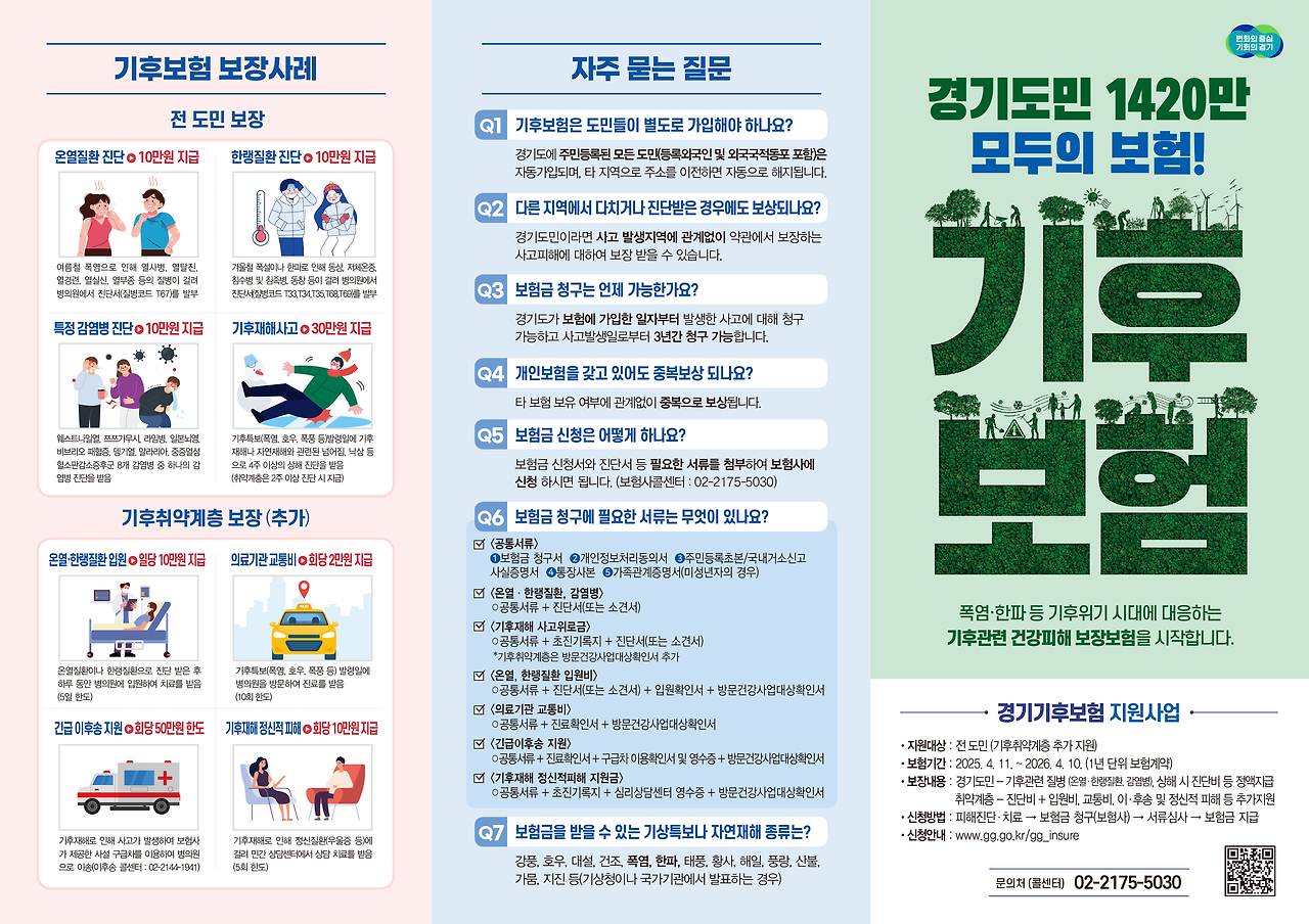 ‘경기 기후보험’은 경기도가 전 도민을 대상으로 기후재난으로 인한 상해 피해를 보장하기 위해 마련한 공공 보험 제도입니다.