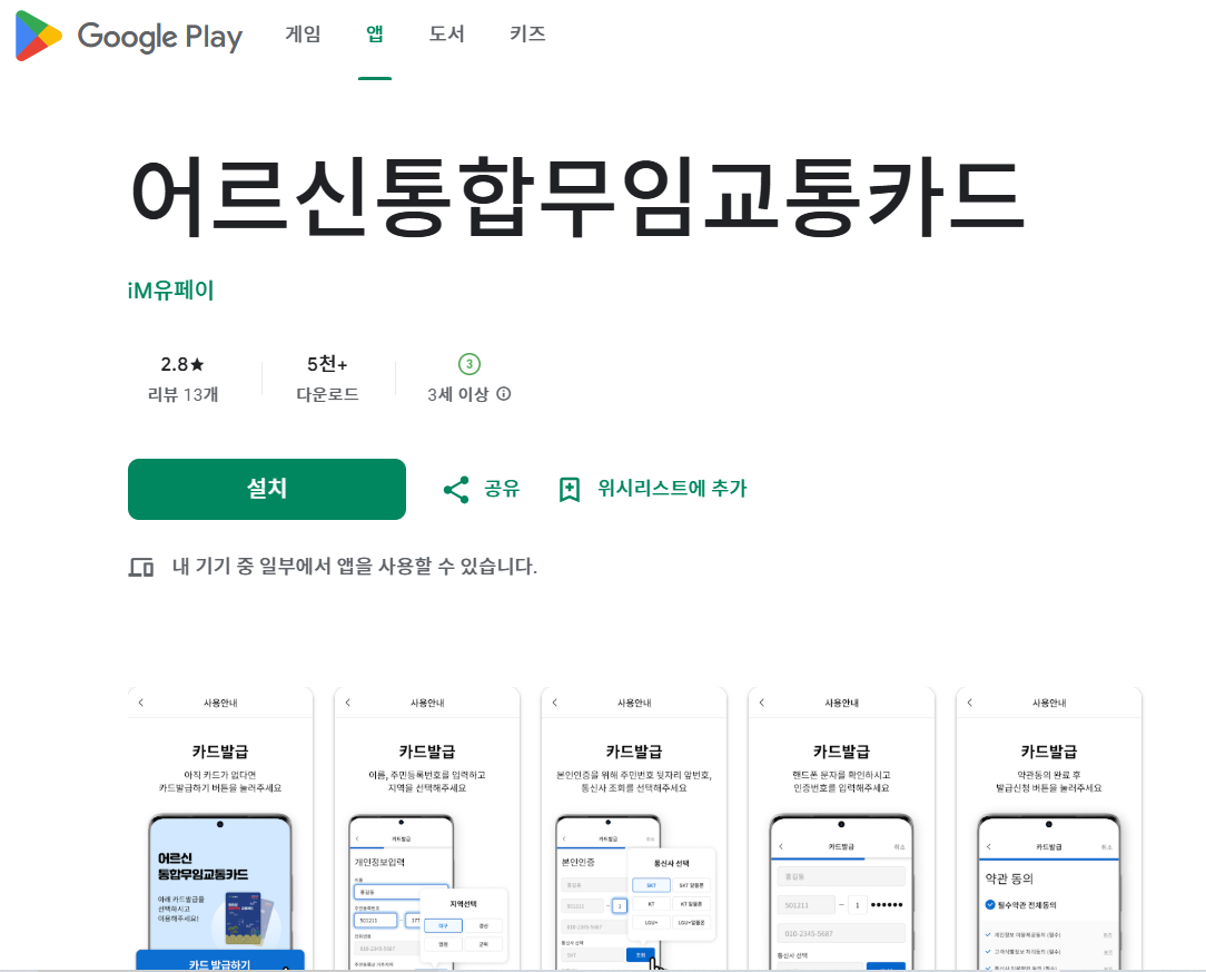 - 개인 스마트폰에 '어르신 통합무임 교통카드' 앱 설치 및 회원가입4