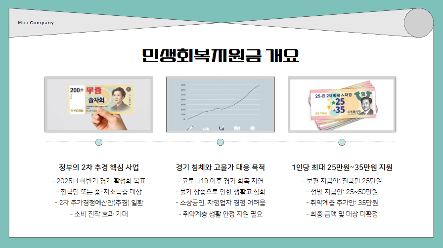 2025년 하반기 경기 활성화를 위해 전국민 또는 중·저소득층을 대상으로 1인당 최대 25만 원에서 35만 원까지 지원하는 방안이 검토되고 있습니다.