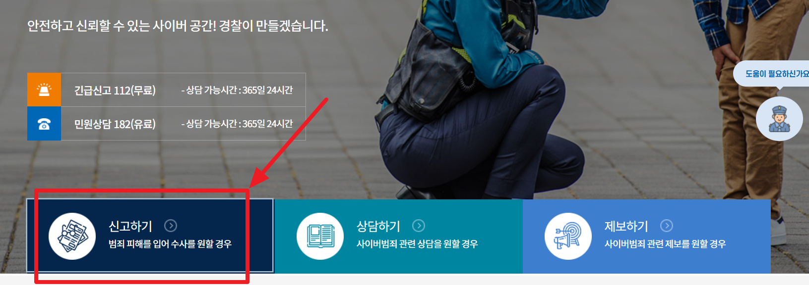 2. 홈페이지 좌측 하단에 있는 ‘신고하기’ 버튼을 클릭합니다.