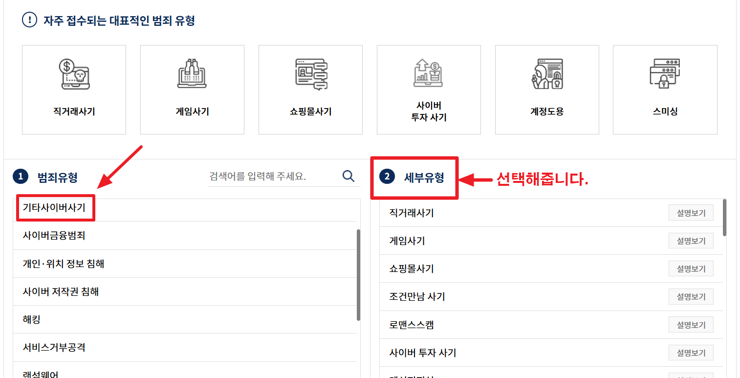 - 다양한 범죄 유형 중 ‘사이버사기’를 선택합니다.