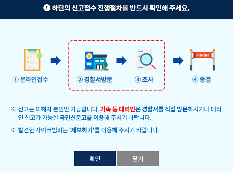 - 증거자료와 함께 접수하면, 사이버범죄 전담 수사관에게 안내됩니다.