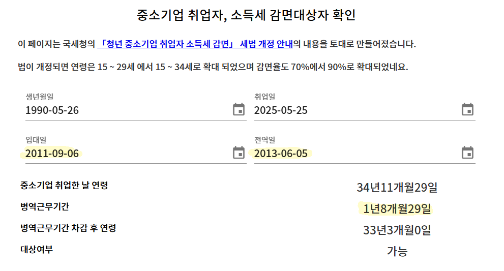 ※ 계산이 어렵다면 이 또한 중소기업 취업자 소득세 감면 계산기를 활용합시다. 입대일과 전역일을 입력한 후 하단의 [병역근무기간]에 뜨는 기간을 [년 월 일]에 적습니다.
