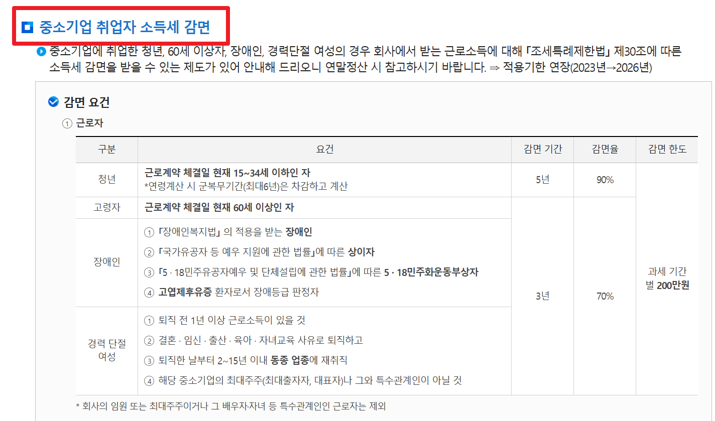 청년, 경력단절여성, 고령자 등이 중소기업에 새로 취업하면 5년간 근로소득에 대한 소득세의 90%를 감면해주는 제도입니다.