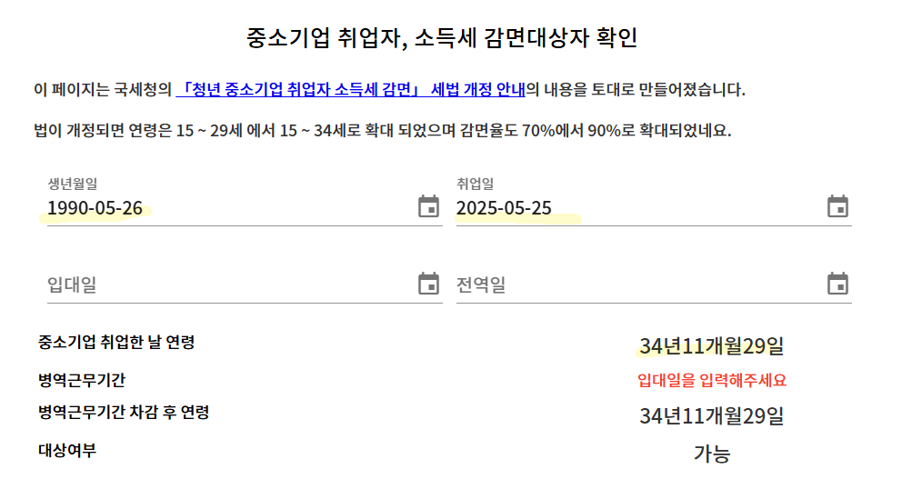 ※ 계산이 어려우니, 중소기업 취업자 소득세 감면 계산기에 접속하여 생년월일과 취업일을 입력합니다. 하단에 뜨는 중소기업 취업한 날 연령을 [년 월 일]에 적습니다.