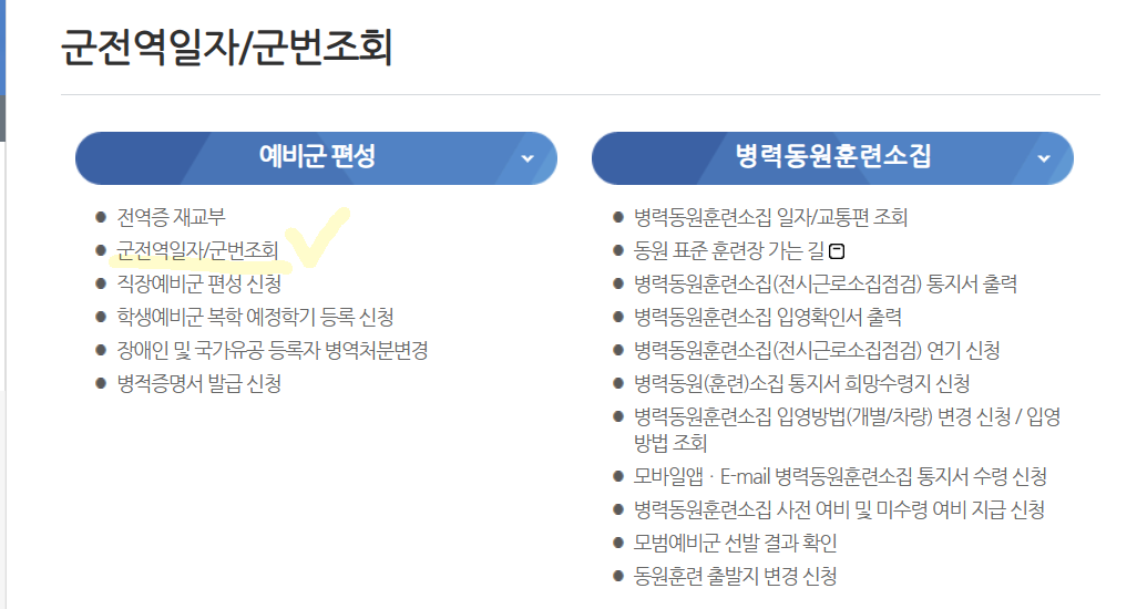 ※ 입대일과 전역일이 기억나지 않는다면? 병무민원포털에 접속하여 [동원/예비군>예비군 편성>군전역일자/군번조회] 페이지에 들어가 날짜를 확인합니다.