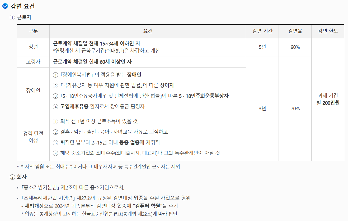 - 제출서류: 감면 신청서, 근로계약서, 중소기업 확인서, 주민등록등본 등