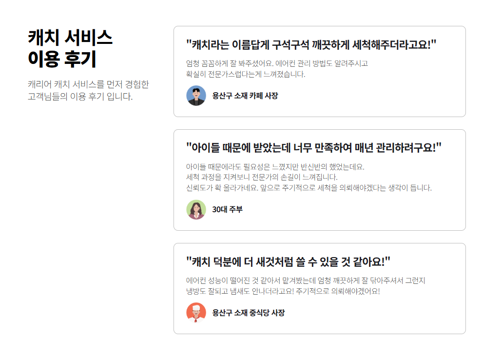 캐치 서비스를 이용한 고객들은 다음과 같은 만족 후기를 남기고 있습니다.