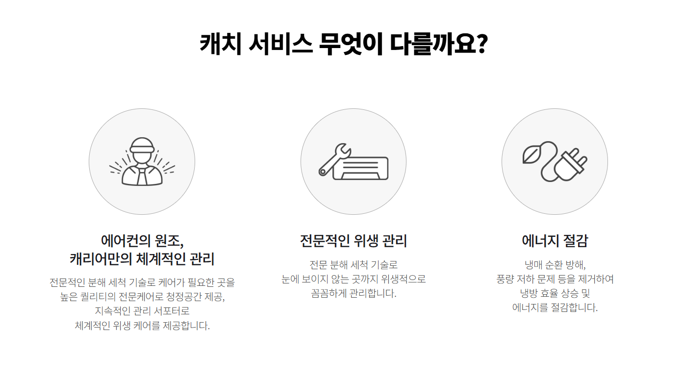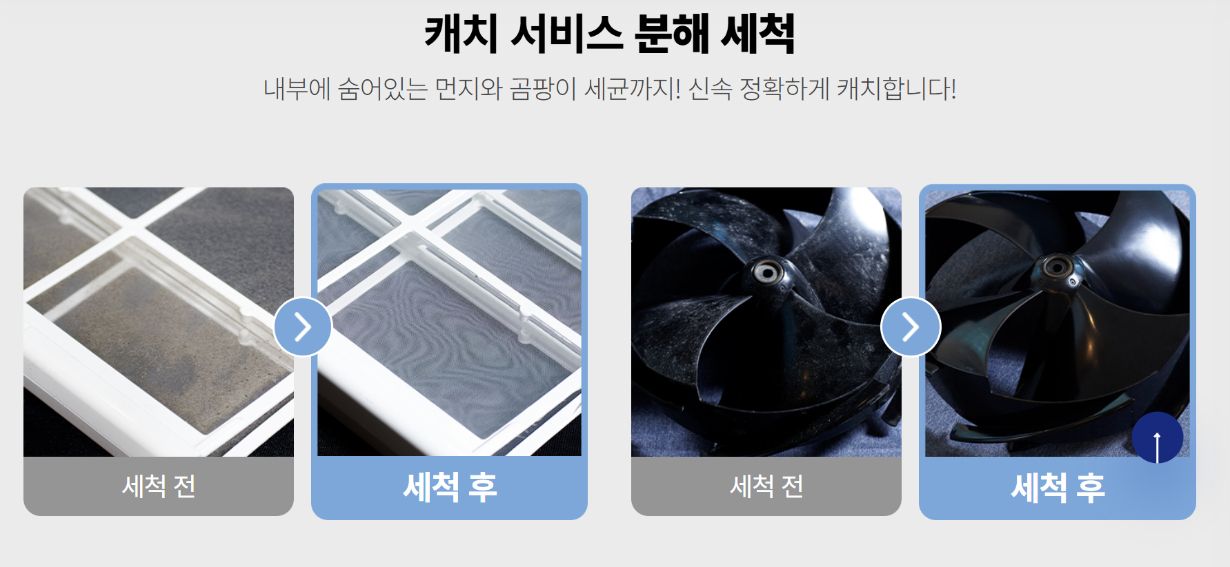 캐치 서비스는 캐리어에서 제공하는 공식 에어컨 분해 세척 서비스로, 에어컨 내부의 먼지, 곰팡이, 세균 등을 제거하여 쾌적한 실내 환경을 유지할 수 있도록 도와줍니다. 특히 냉방 효율을 높이고 에너지 절감을 도와주는 효과도 있습니다.